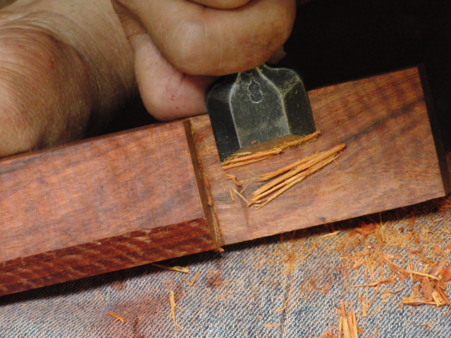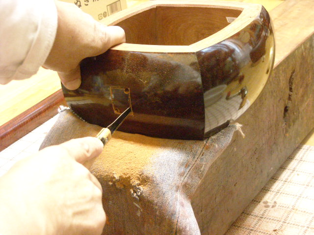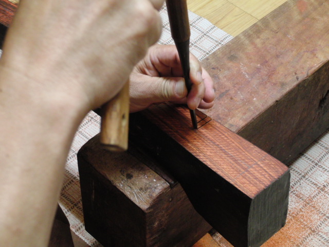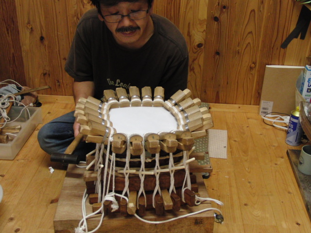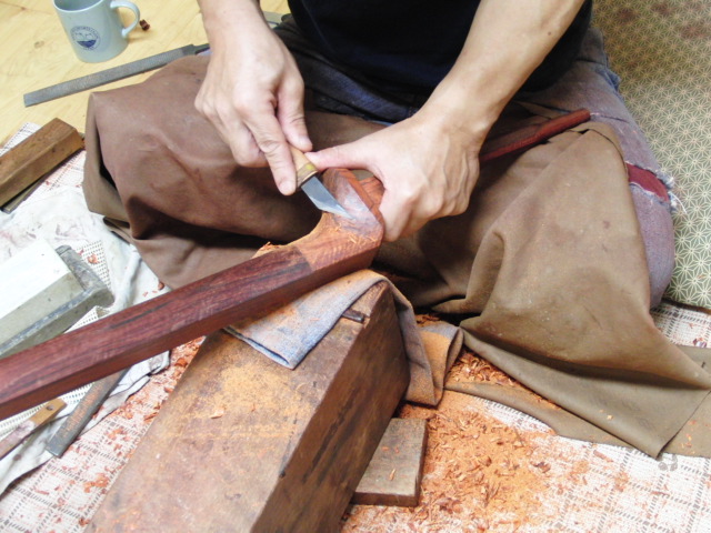 三味線が出来る迄 製作者 三絃師 花田裕二 木取り 荒木の切断 三つに切断 切違いしながら上・中・下に 切り分け はだをつく 鑿で寸分の狂いなくはだと溝を作ります 臍金と溝 臍金が入り溝ができました 上・二本溝 下・段溝 まるめ 棹をつなぎまるめの作業 天神 天神を作ります 裏をさらう なまぞりという曲がった小刀 で裏をさらう はなを作る 小刀とやすりではなをつくります 棹の完成 棹を磨いて完成です 私は五種類の砥石とペーパーを使います 胴 胴を仕込む ジャンルによって仕込みのハは変わります 皮張 きせん張りで皮を張る 焼き印 自分で作ったものは焼き印します アイテムデータがありません。